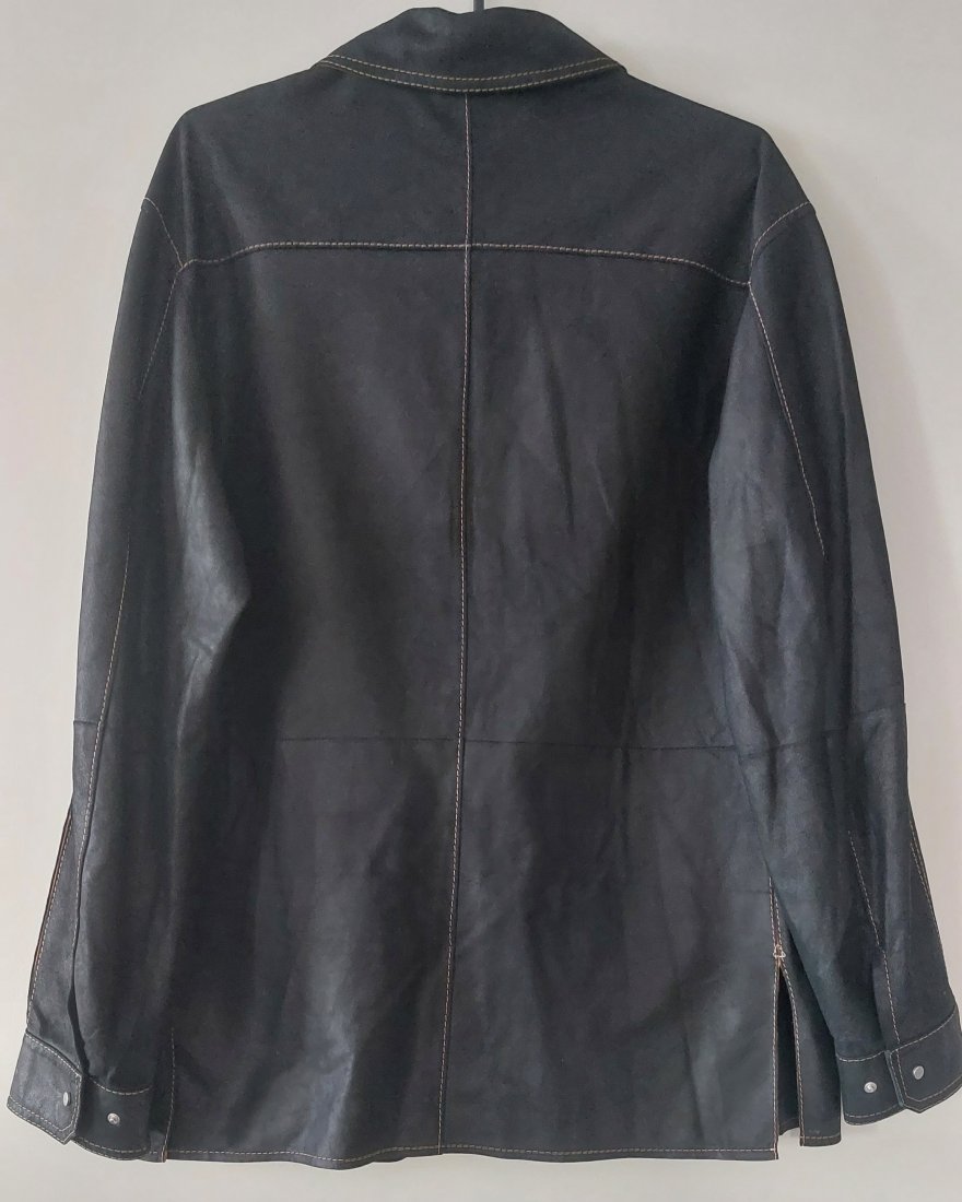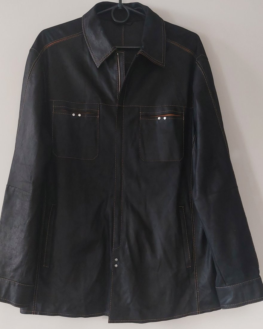 Brązowa kurtka koszulowa wykonana z cienkiej skóry z kontrastowymi przeszyciami, bez podszewki ,zapinana na zamek.