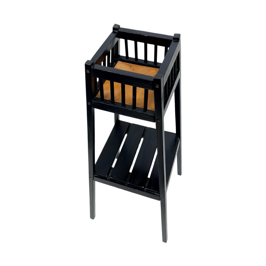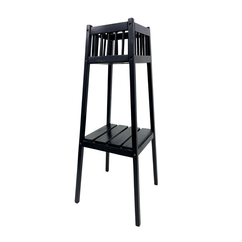 Oryginalny drewniany stojak / kwietnik w stylu vintage modern / mid-century, wykonany w całości z litego drewna, malowanego na czarny kolor. Forma oparta na smukłych nogach, z górną ażurową skrzynką oraz praktyczną dolną półką, nadaje całości lekkości i funkcjonalności.
