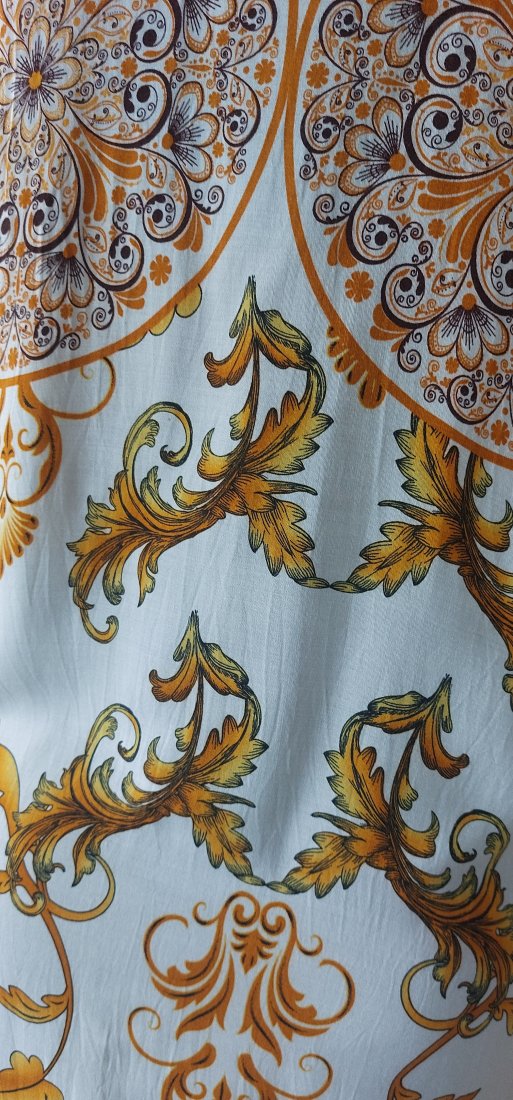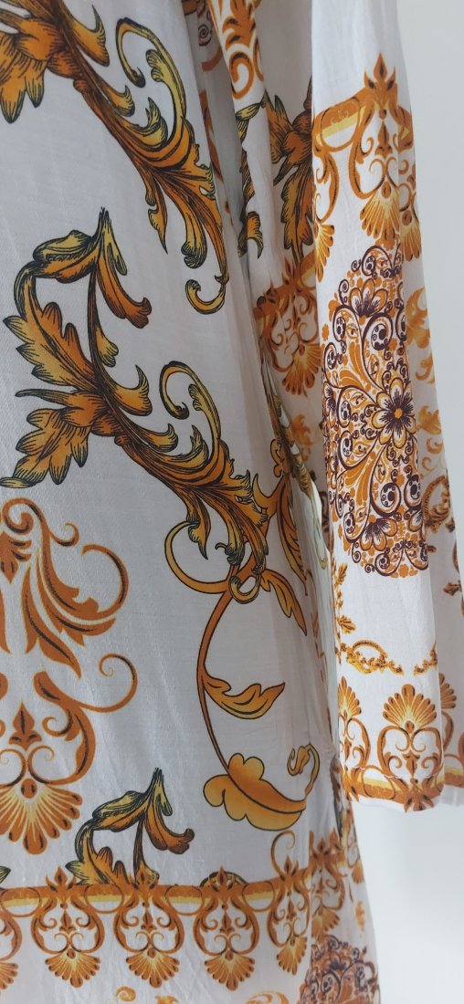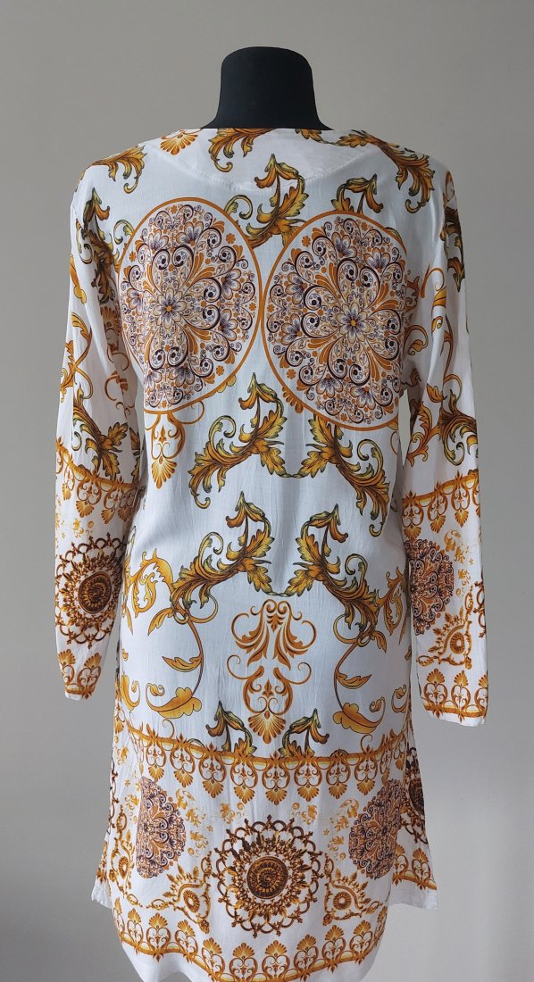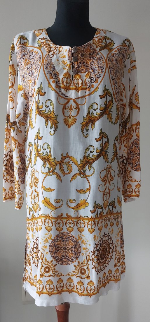 Sukienka z lekkiej, przewiewnej wiskozy wykonana na zamówienie, stan bardzo dobry, brak uszkodzeń i zabrudzeń. Sugerowany rozmiar S/M. Prosty krój, po bokach rozcięcia. Długość 89 cm, szerokość pod pachami 52 cm, pas 49 cm, biodra 50 cm, długość rękawa od pachy 38 cm.
