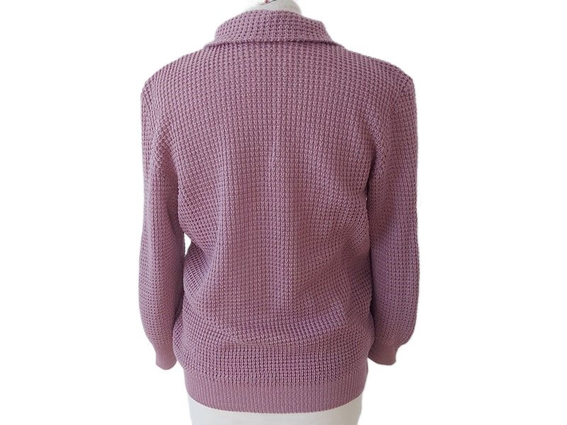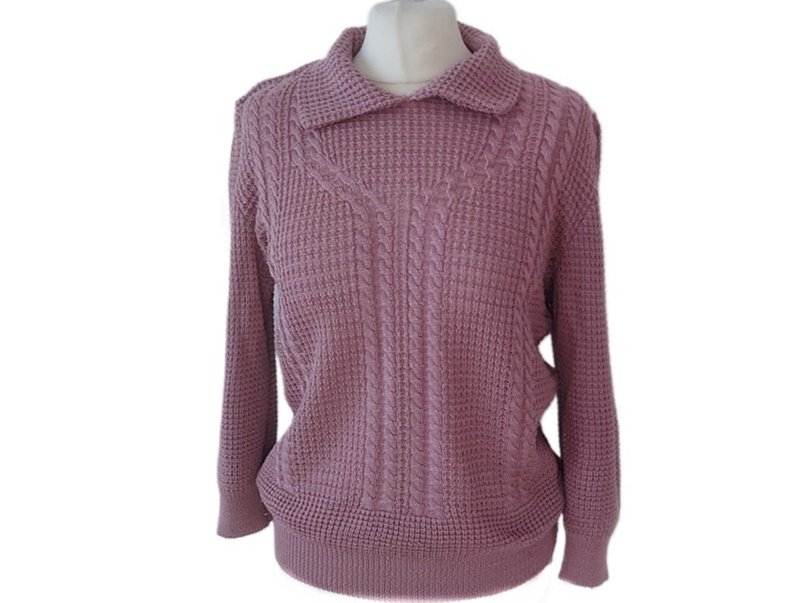 Nostalgia lat 80. w pełnej odsłonie. Ten sweter to kwintesencja tamtej dekady: z ozdobnym, plecionym splotem z przodu oraz klasycznym kołnierzem. Odcień starego różu jest przyjemny i stonowany, doskonale komponuje się z beżami, brązami, kremami oraz pastelową zielenią, tworząc harmonijną całość. Sweter sprawdzi się zarówno w eleganckich, jak i bardziej swobodnych stylizacjach.
