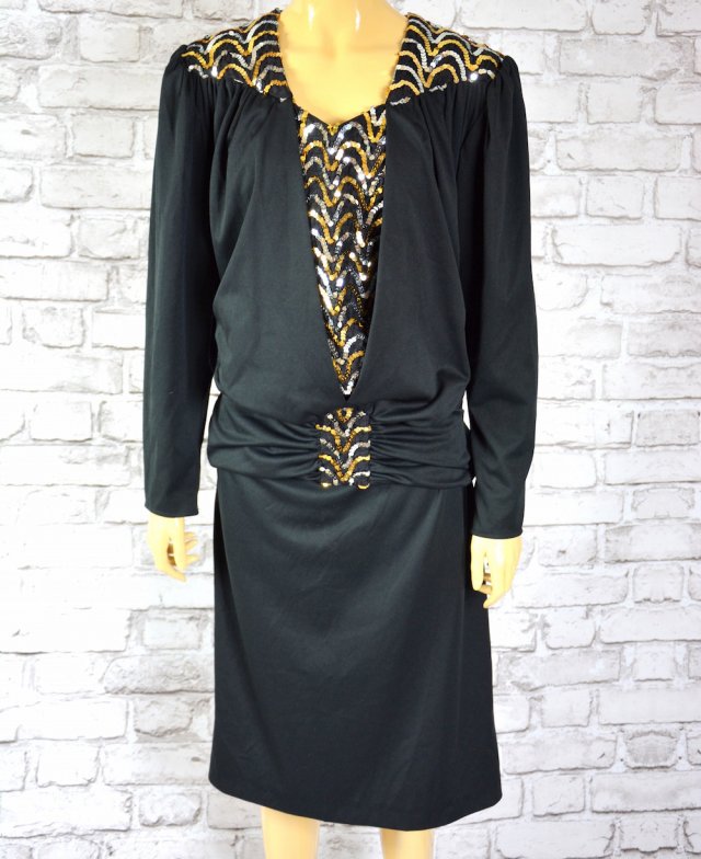 Czarna sukienka w klimacie Vintage,wykonana z delikatnie elastycznej tkaniny, góra sukienki zdobiona cekinami., sukienka wygląda jakbyśmy miały w górnej części żakiet, wszystkie części sukienki są ze sobą zszyte. Góra sukienki luźniejsza, dół węższy. Bardzo fajna.