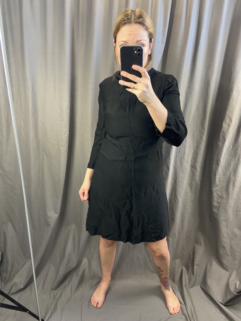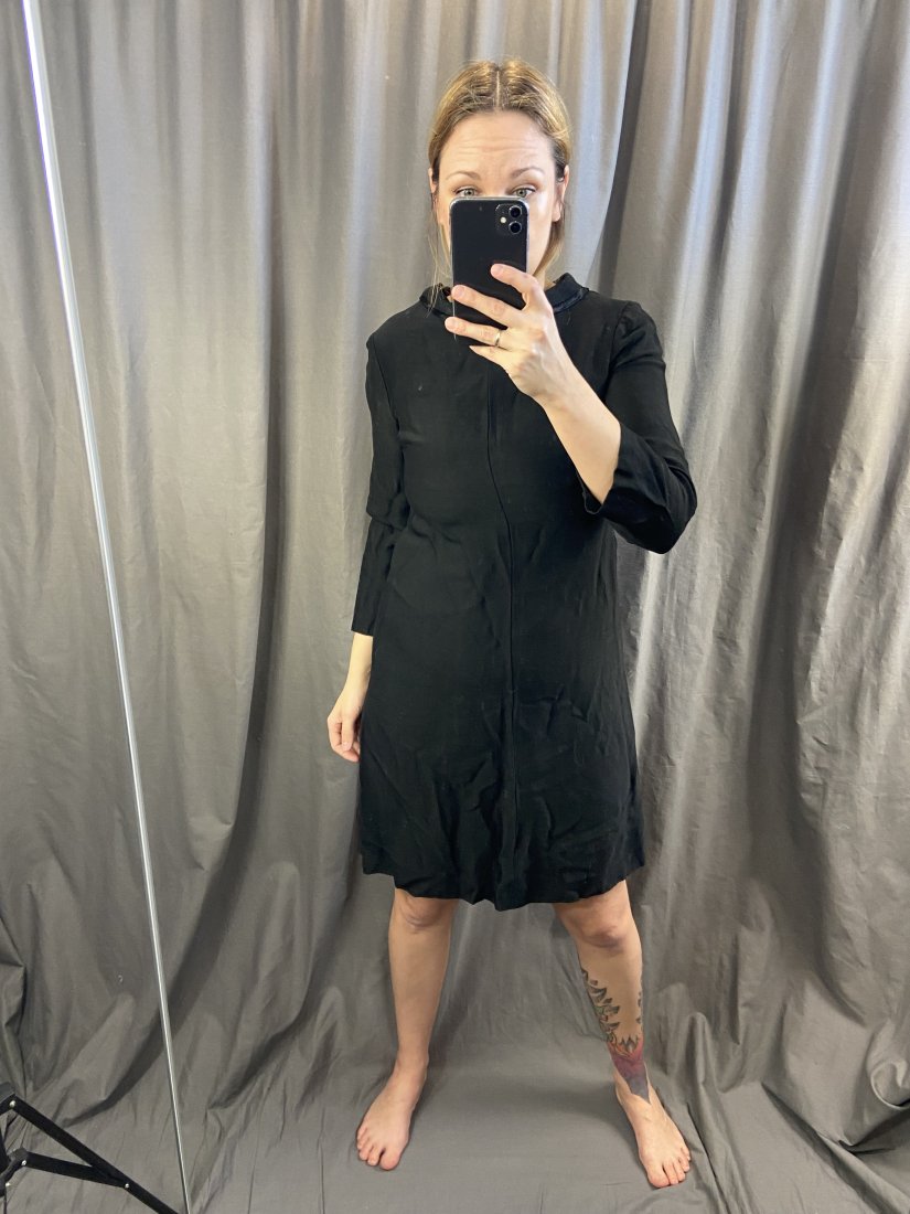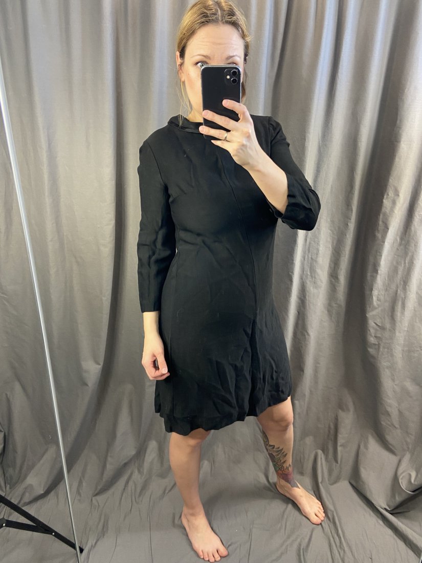 Prosta mała czarna z kołnierzykiem. Vintage. Materiał w dotyku naturalny, to takie płótno tkane, z jednej strony (wierzch) matowe, od spodu atłasowe w dotyku. Sukienkę datuję na lata 30-40te.
