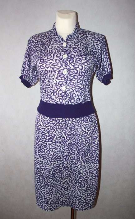 bardzo oryginalna wzorzysta, cienka sukienka vintage z materiałowymi ściągaczami w pasie i przy rękawkach, w odcieniach ciemnego fioletu, zapinana z przodu na guziki, mini kołnierzyk, z tyłu mały rozporek, lekko motylowe rękawki, ściągacz w pasie nie jest wszyty w sukienkę tylko jest na jej wierzchu, brak metki ze składem i rozmiarem