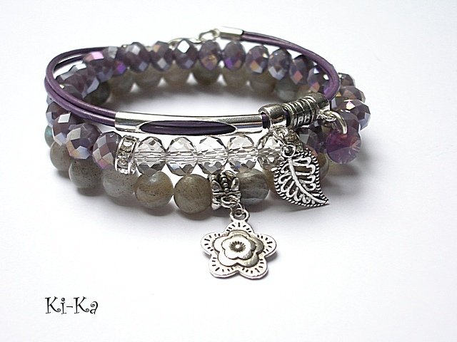 Komplet trzech bransoletek wykonany z kamieni naturalnych - labradoryty [10mm], kryształki [8mm],rzemień z naturalnej skóry, przywieszki z kryształkiem Swarovskiego oraz elementów w kolorze srebrnym. Pasują na nadgarstek 16-17cm. Bransoletki z kamieni i kryształków na gumce silikonowej. Biżuteria ozdobnie zapakowana