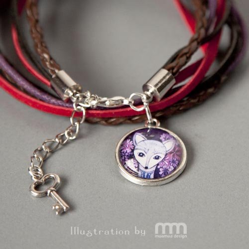 Bransoletka z możliwością noszenia jako naszyjnik, to bardzo romantyczne, nostalgiczne i kobiece malutkie dzieło sztuki. Obrazek pod szkiełkiem to autorska ilustracja. Bransoletka z kilku rzemieni prezentuje się wspaniale, a zawieszka oraz medalion dopełniają romantyczną stylistykę .
