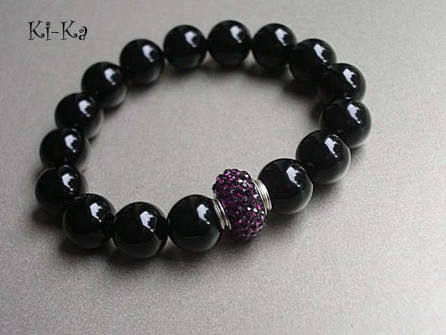Bransoletka wykonana z naturalnych minerałów - onyks [12mm] oraz elementów w kolorze srebra [przekładka wysadzana kryształkami] Pasuje na nadgarstek 15- 16,5cm. Bransoletka na gumce silikonowej. Biżuteria ozdobnie zapakowana. Bransoletka może stanowić komplet z innymi - przykładowe zdjęcia