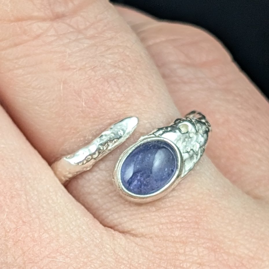 Pierścień wykonany ze srebra próby 925. Rozmiar pierścionka dzięki otwartej podstawie regulowany na dowolny rozmiar w zakresie 9-23. Proszę napisać po zakupie na jaki ustawić. Ozdobą pierścionka jest szlachetny, naturalny tanzanit o pięknym fiołkowym odcieniu. Wymiary oprawy kamienia 15 x 11 mm, szerokość maksymalna obrączki 6 mm, min. 4 mm. Waga 4,9 g. Pierścień zostanie zapakowany w ozdobne pudełeczko.