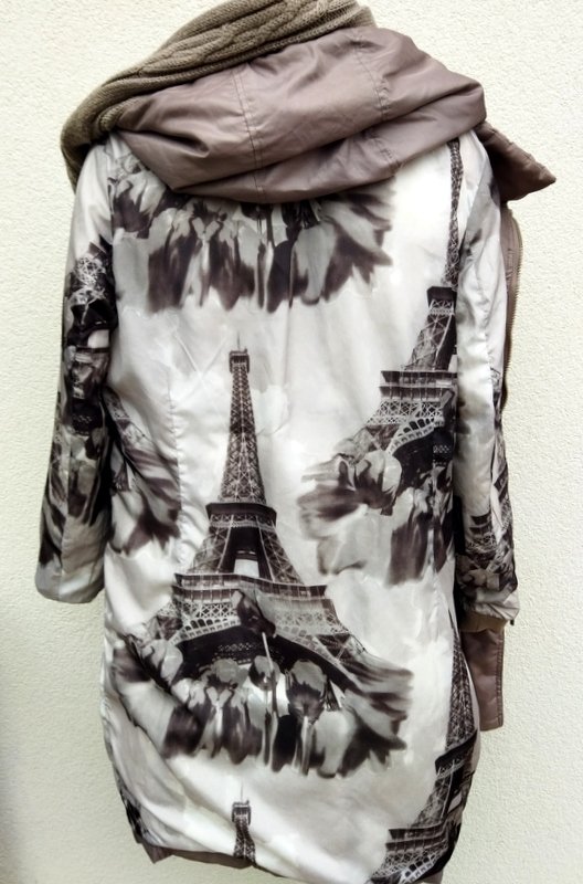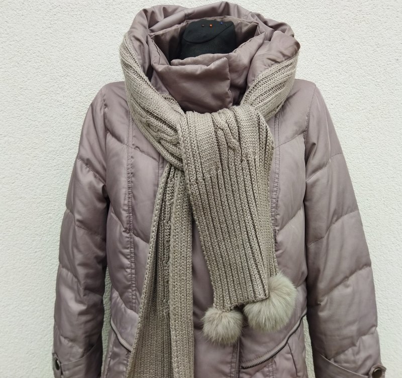Puchowy pikowany płaszcz lub dłuższa kurtka w oliwkowym kolorze z dzianinowymi elementami wykończeniowymi w tym samym kolorze ( doszywany szalik i dzianinowe ściągacze - na zdjęciu znacznie się różnią wyszedł odcień w brązie, w realu zarówno płaszcz jak i szalik jest oliwkowy. Starannie uszyty i wykończony , z licznymi detalami. Kołnierz typu wyższa stójka, ciekawie skomponowany szal z pomponami z króliczego futerka doszywany do kaptura dopinanego na zamek ( można go odpinać) , w talii pasek/plisa obszyty zamkiem, dwie wpuszczane kieszenie z zamkami, ozdobne mankiety rękawów z doszywanymi do podszewki dzianinowymi ściągaczami dodatkowo chroniącymi przed chłodem. Zapinany na zamek ukryty pod dwurzędowym zapięciem na napowe guziki. Całości dopełnia ładna wzorzysta podszewka . Dużo ładniejszy w realu.