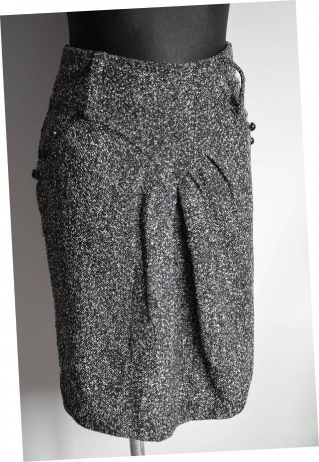 Spódnica dzianinowa marki VIVESSA. Bardzo elegancki krój tulipana. Wielobarwna (czarno-szaro-biała ze srebnym połyskiem). Na biodrach guziki w formie ozdoby. Zapinana na zamek z tyłu. Szlufki na szeroki pasek. Rozcięcie z tyłu. Na podszewce.