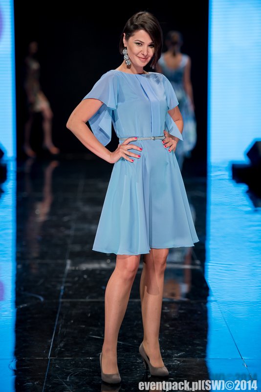 Letnia, romantyczna sukienka z odcięciem w talii uszyta z błękitnego szyfonu, na podszewce. Góra dopasowana z ozdobną listwą po środku, dekolt na plecach, luźne rękawki, dół z pół koła, zamek kryty, długość około 55 cm od talii.