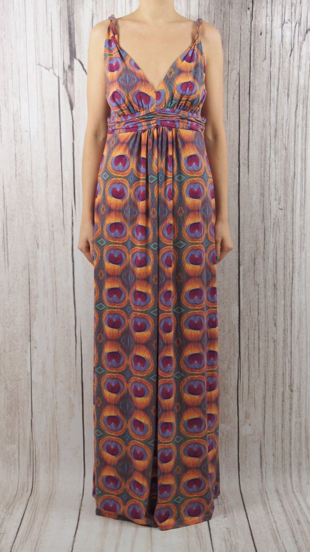Przepiękna letnia sukienka projektu Pauli Hermanny (marka ViX). Wykonana z nylonu z dodatkiem spandexu, warstwa wewnętrzna z poliestru. Materiał jest przemiły w dotyku, lejący się. Cena sklepowa długich sukienek tej marki to 200-500$.