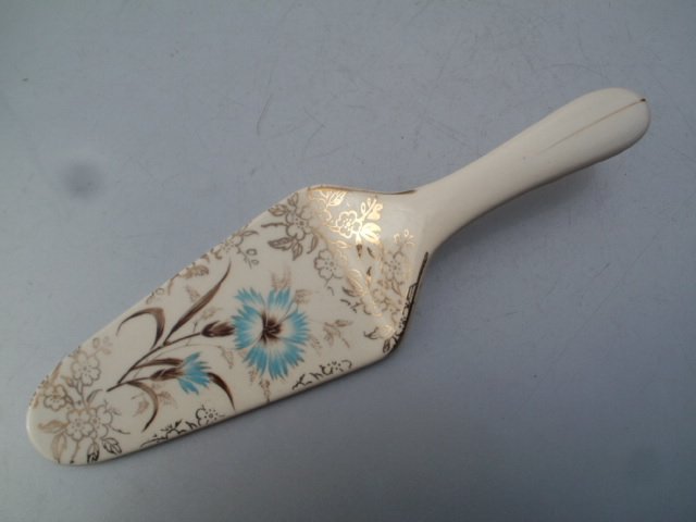 Oryginalna porcelanowa łopatka do ciasta , bardzo ciekawie zdobiona. Płaski spód pozwala na szybkie i bezpieczne jej odstawienie. Sygnowana " Vogue tableware by Aynsley & Co. Ltd England 73 ". Klasyczna forma i eleganckie, subtelne zdobienie .Niuanse niebieskości, brązy i złoto. Oryginalna, praktyczna, dekoracyjna, niespotykana. Wykończenie błyszczące. Góra 24 x 6,5 x wys. Około 2,5 cm szer. Rączki trochę ponad 2 cm .