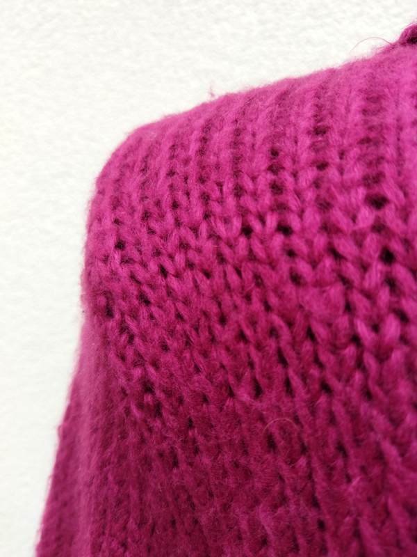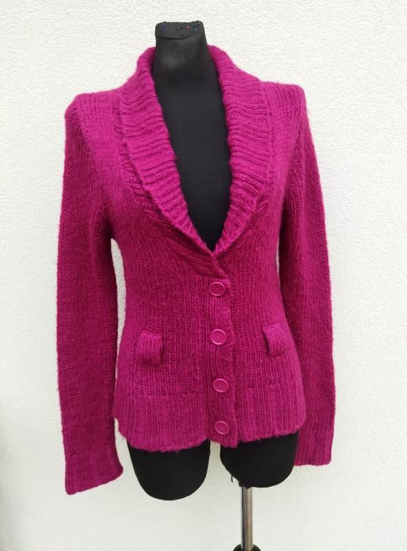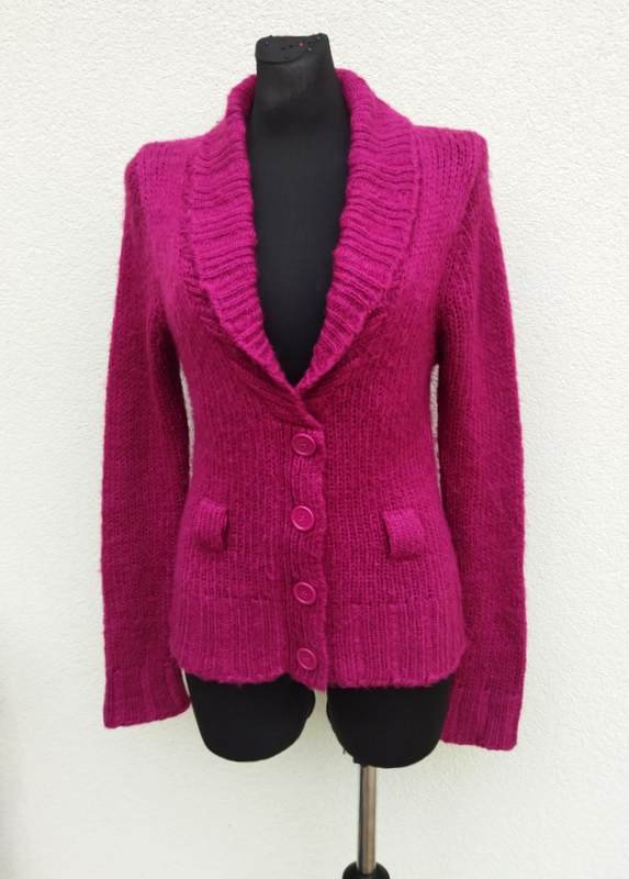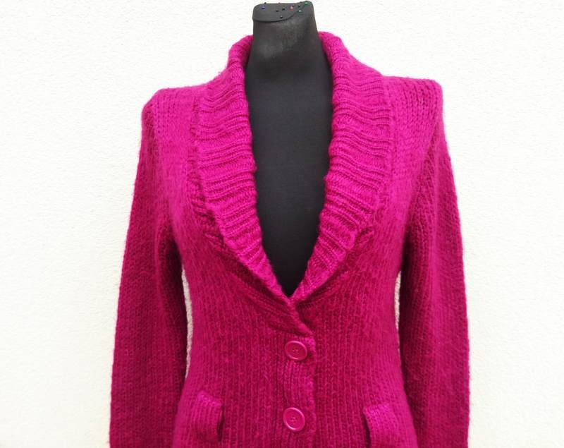 Rozpinany sweter z miłej puszystej akrylowej włóczki z moherową faktura w amarantowym kolorze Taliowany z szalowym kołnierzem, ze szlufkami. zapinany na ozdobne guziki w kolorze swetra. Wykończony ściągaczami.