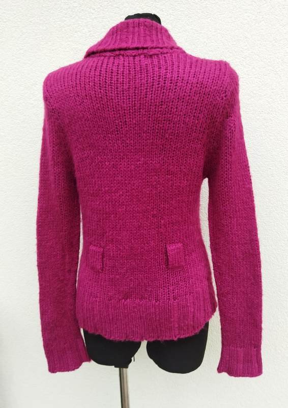 Rozpinany sweter z miłej puszystej akrylowej włóczki z moherową faktura w amarantowym kolorze Taliowany z szalowym kołnierzem, ze szlufkami. zapinany na ozdobne guziki w kolorze swetra. Wykończony ściągaczami.