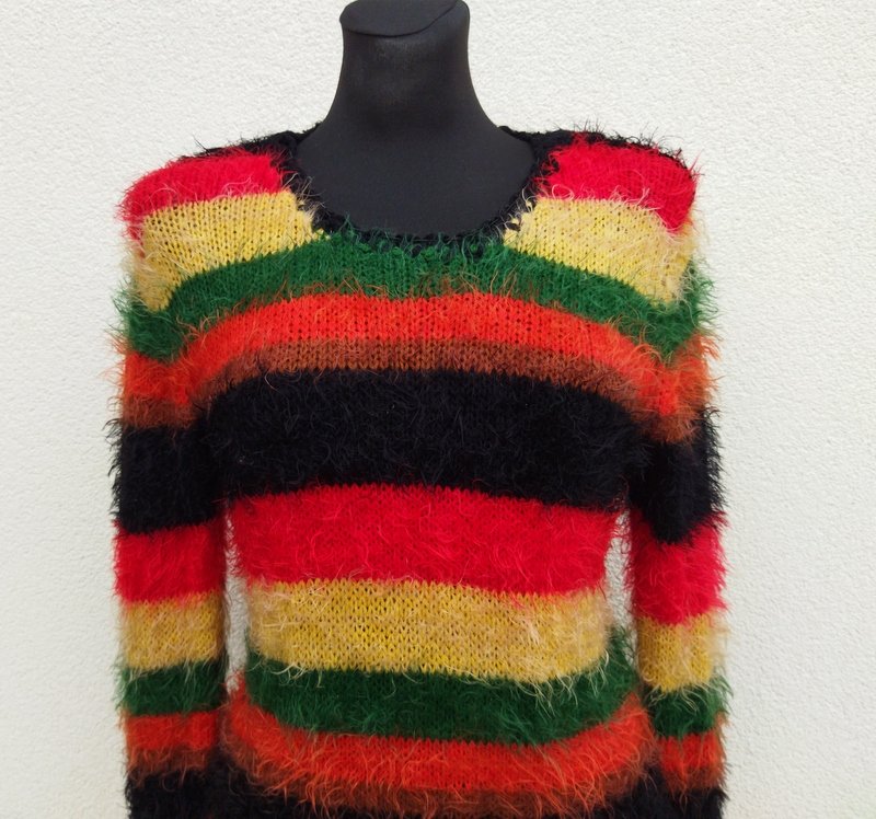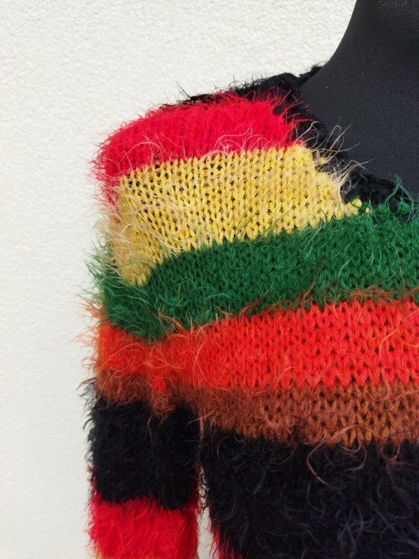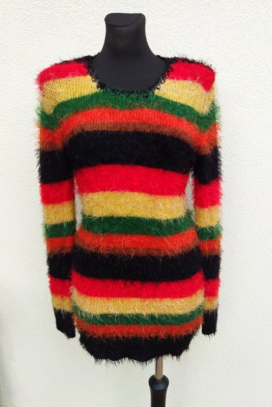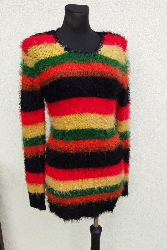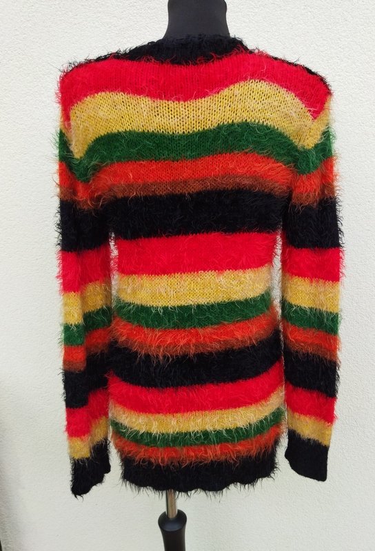 Miły, mocno rozciągliwy sweter z kosmatej włóczki w kolorowe pasy . Wykończony ściągaczami.