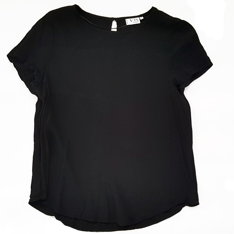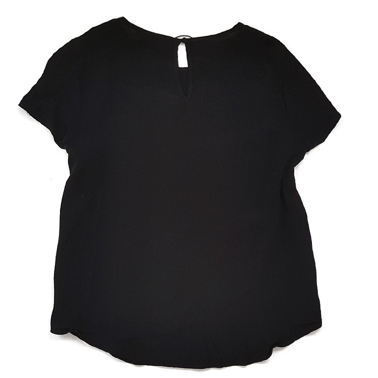 Czarna klasyczna bluzka z krótkim rękawem, z tyłu zapięcie na guzik, dół wykończony półokrągło. Uniwersalny basic z przyjemnej, lejącej wiskozy, sprawdzi się w każdym zestawieniu.