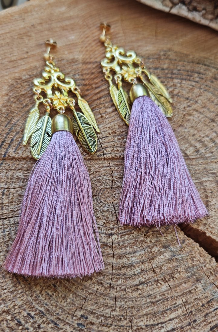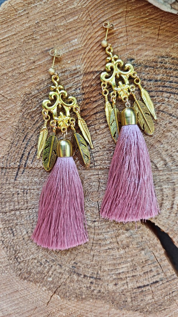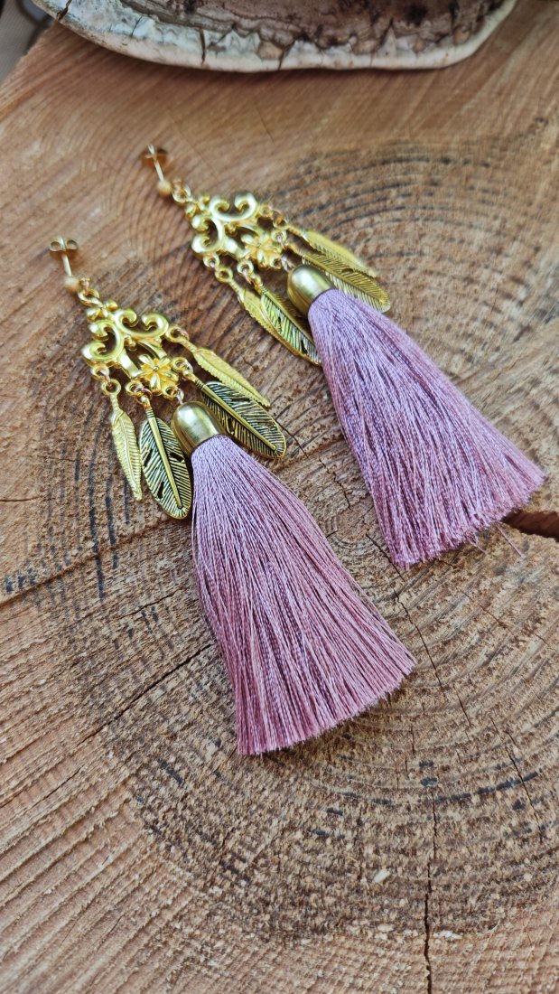 ,,w beżu,, to bardzo kobiece kolczyki wykonane z chwosta w odcieniach beżu i metalowych elementów w kolorze złota. Kolczyki zawieszone są na ozdobnych biglach typu sztyft wykonanych ze stali szlachetnej.