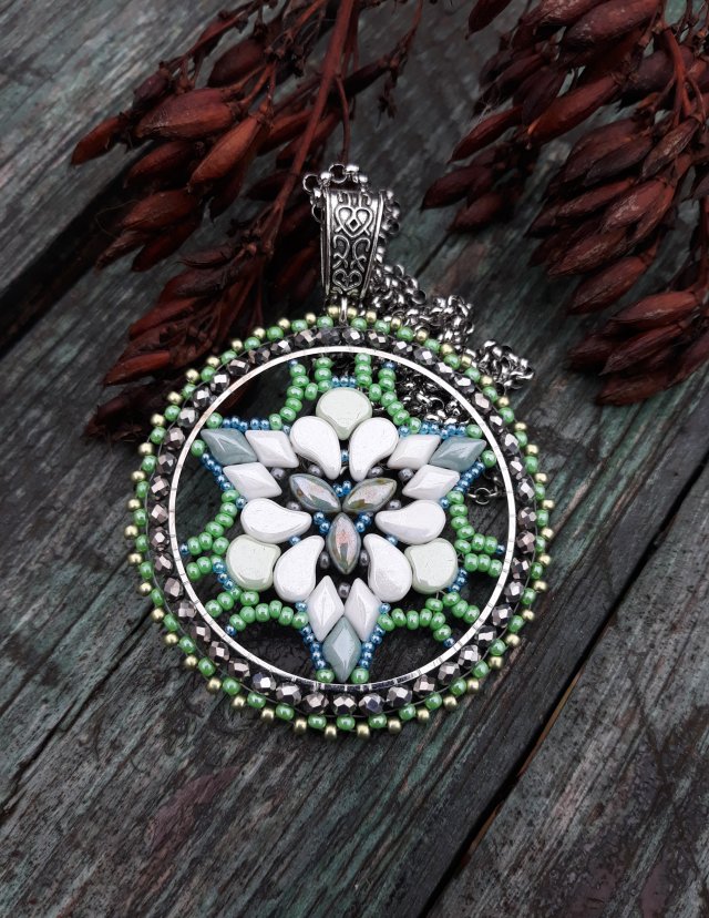 ,,w bieli i zieleni,, to ażurowy wisior wykonany na obręczy ze szklanych koralików i kryształków w różnych odcieniach zieleni, srebra i bieli. Wisior zawieszony jest na ozdobnym łańcuszku w kolorze ciemnego srebra.