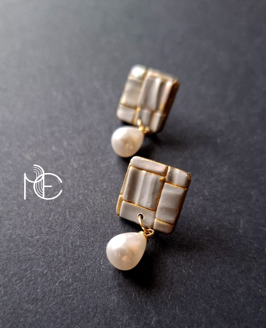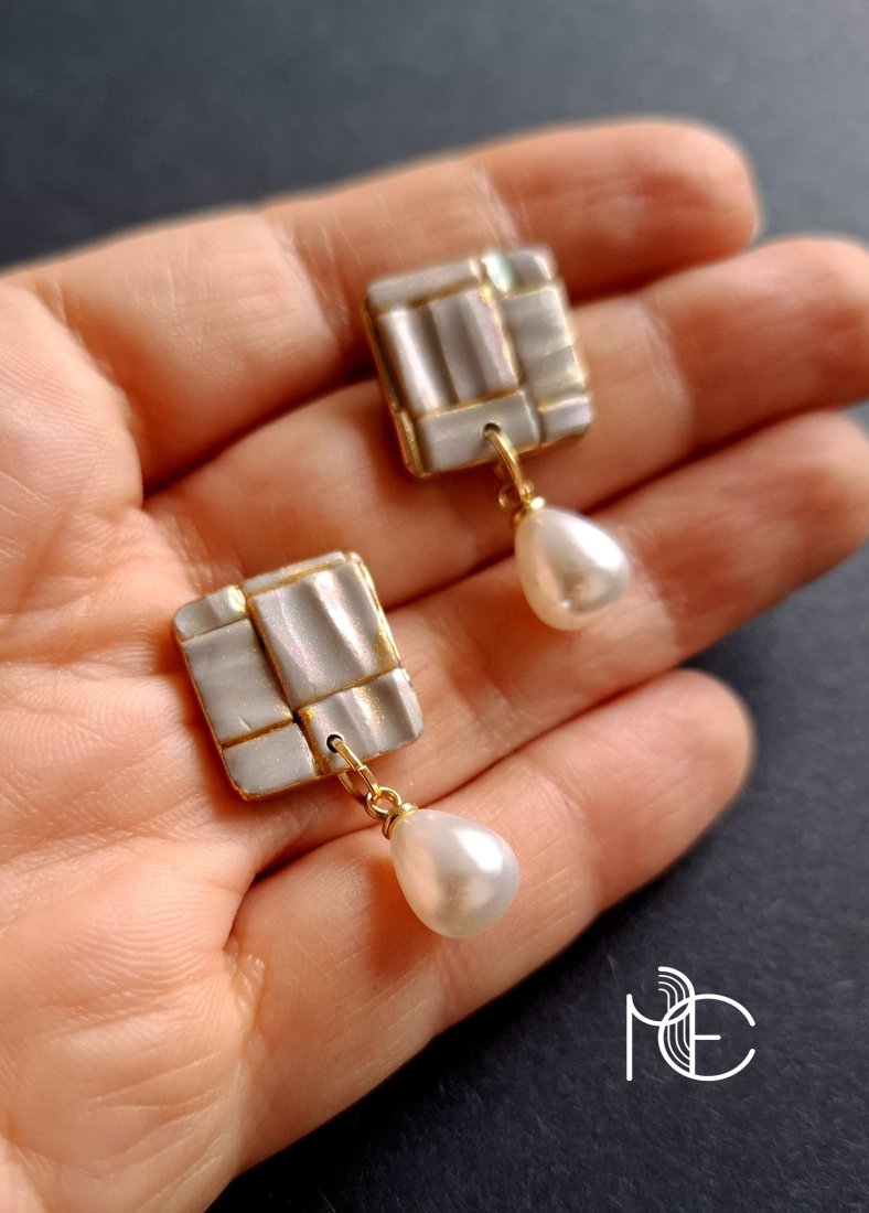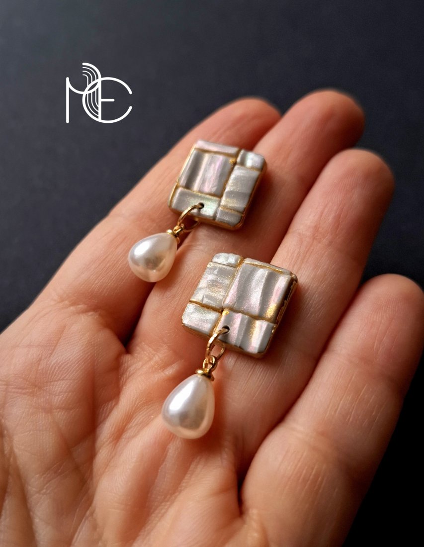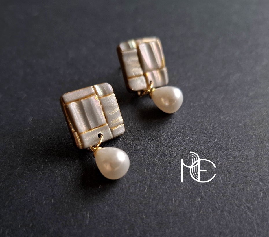 Eleganckie kolczyki na sztyfty z podwieszonymi szklanymi perełkami, wykonane z wysokiej jakości glinki polimerowej w efekcie mieniące się różnymi barwami w zależności od kąta padania światła niczym mozaika z masy perłowej. Jednostronne z pozłacanymi, nieuczulającymi sztyftami. Wymiary: długość wraz z zapięciem: 3 cm; szerokość max. 1,5 cm. Wykonane w jedynym egzemplarzu.