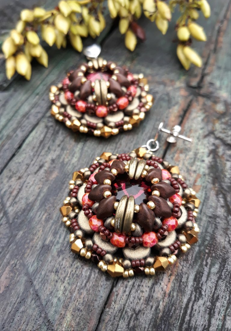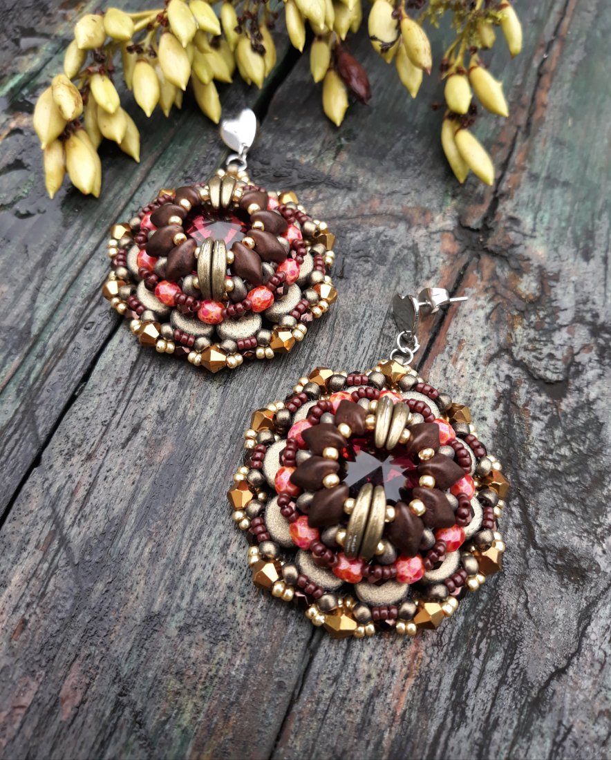 ,,w brązach,, to niezwykle kobiece kolczyki utrzymane w kolorystyce brązu i starego złota ażurowe kolczyki wykonane ze szklanych koralików i kryształków. Kolczyki zawieszone są na ozdobnych biglach typu sztyft wykonanych ze stali szlachetnej.
