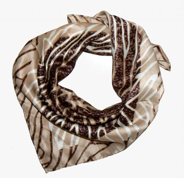 Jedwabna apaszka gawroszka ze zwierzęcym motywem w brązach i beżach.