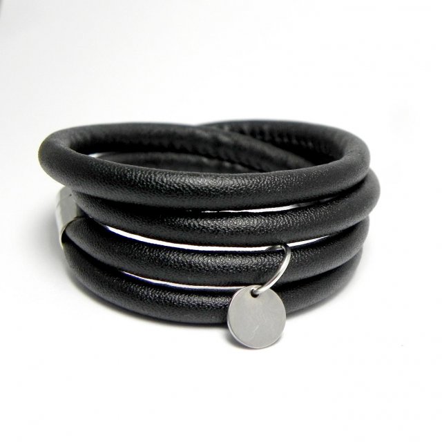 Bransoletka wykonana z grubych, szytych rzemieni ze skóry ekologicznej oraz elementów w kolorze srebrnym. Bransoletka będzie odpowiednia na nadgarstek 16-17 cm, podwójnie owijana.