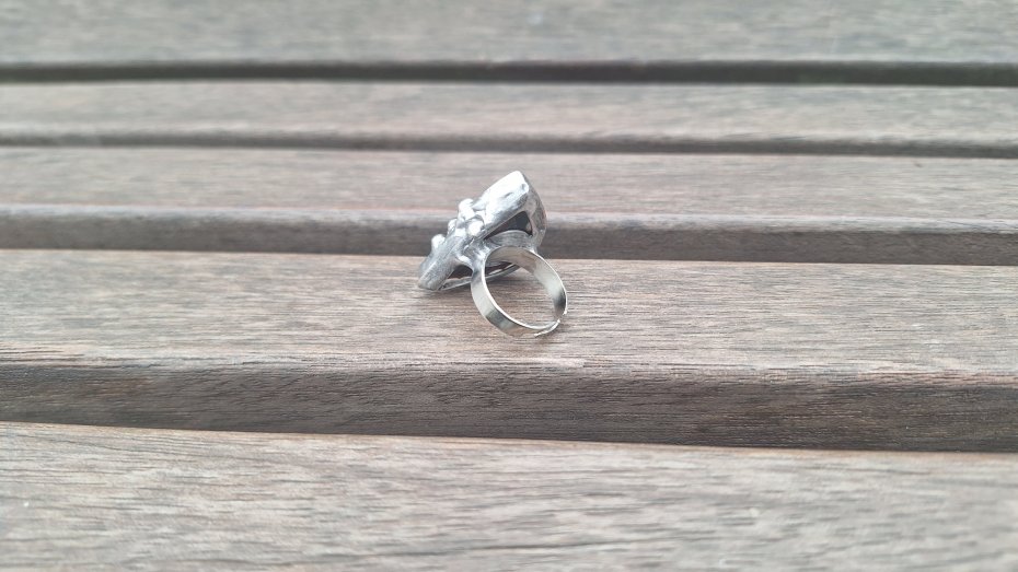Pierścionek wykonany z miedzi, cyny i agatu. Wymiary ok. 3 na 2 cm. Regulowany. Nie jest ciężki.