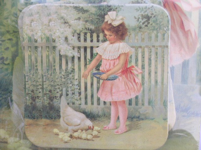 Ujmująco dekoracyjne, jakościowe podkładki - komplet dwóch dużych i czterech małych. Odporne na gorąco i wodę, specjalną powłoką zabezpieczone. Amerykańskie, z obrazkiem w takimże, dawnym stylu :) 21 x 14 oraz 9,5 x 9,5 cm. Stan zachowania bardzo dobry - nowe, nie odpakowane. Doskonałe na prezent.
