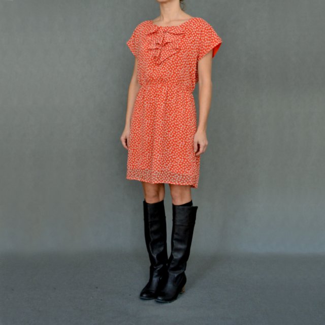 Śliczna i słodka sukienka w drobne kwiatuszki. W talii gumka. Pod szyją kokarda - żabocik. Bardzo zwiewna. Idealna na wiosnę i lato i do grubych, długich swetrów. Polecam.