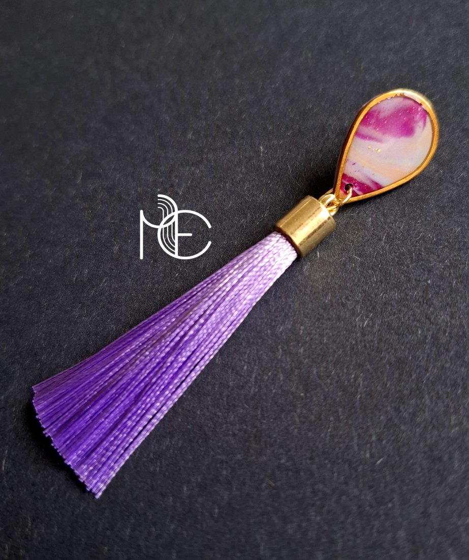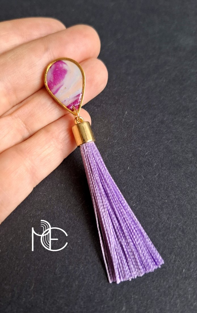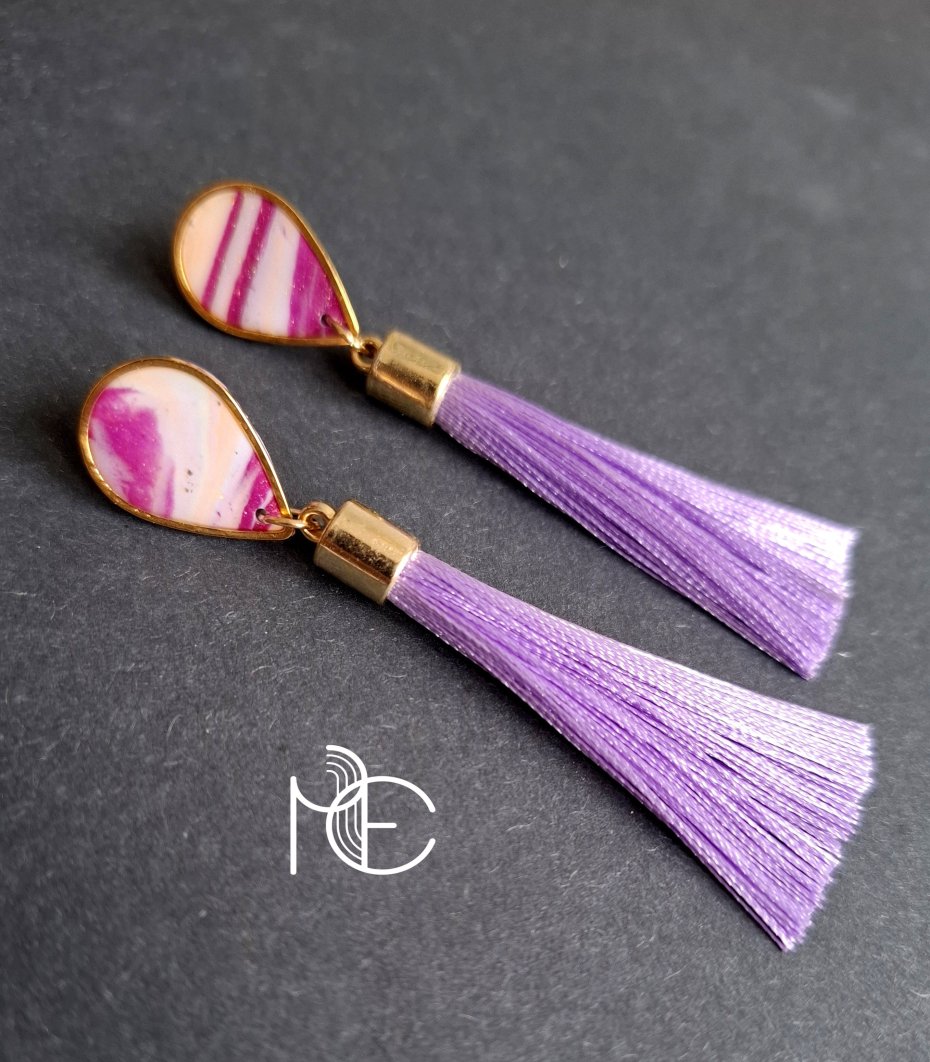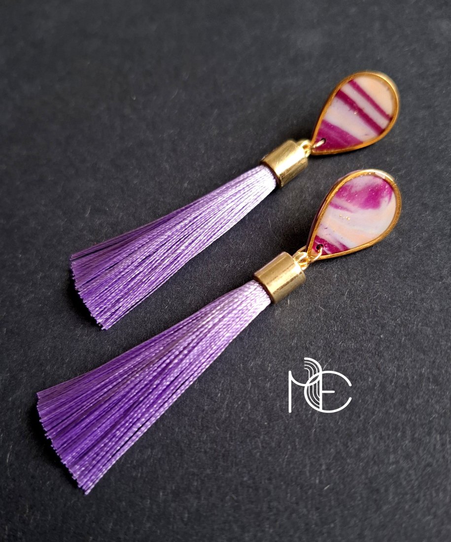 Kolczyki na sztyfty wykonane z wysokiej jakości glinki polimerowej z dodatkiem ozdobnych elementów metalowych oraz jasnofioletowych chwostów. Jednostronne z pozłacanymi, nieuczulającymi sztyftami. Wymiary: długość całkowita: 8 cm; szerokość max. 2,5 cm. Wykonane w jedynym egzemplarzu.