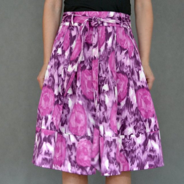 Piękna spódnica w fioletowe wzory wykonana z wysokogatunkowej bawełny. Materiał sztywniejszy, trzyma formę. Sprawdzi się na każdą porę roku, gdyż nie jest cieniutka. Po bokach kieszonki, wiązana w talii.