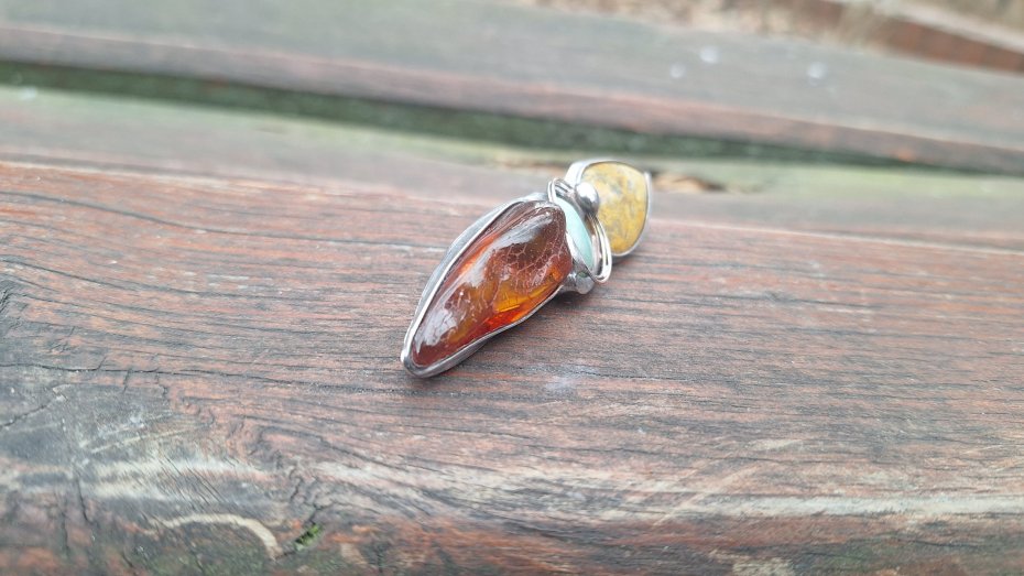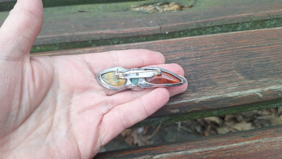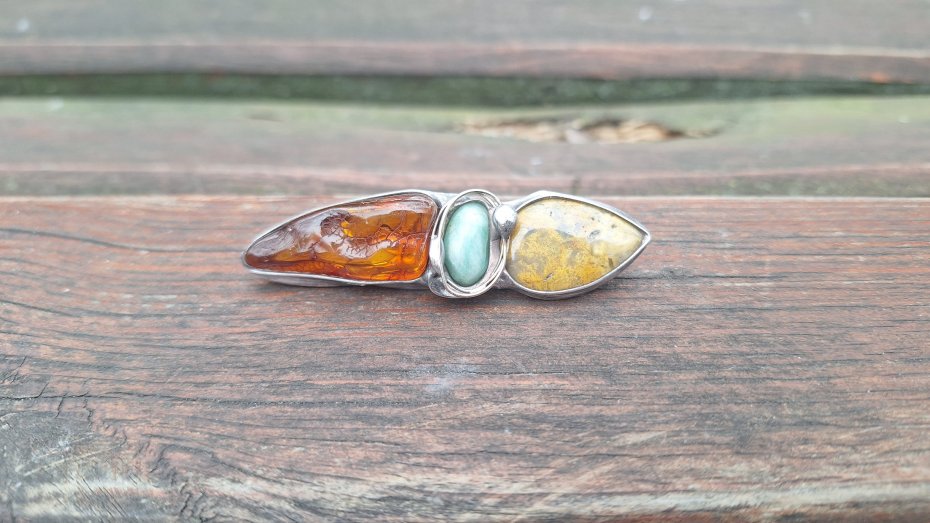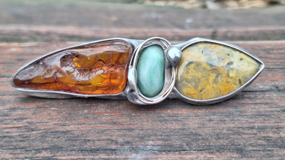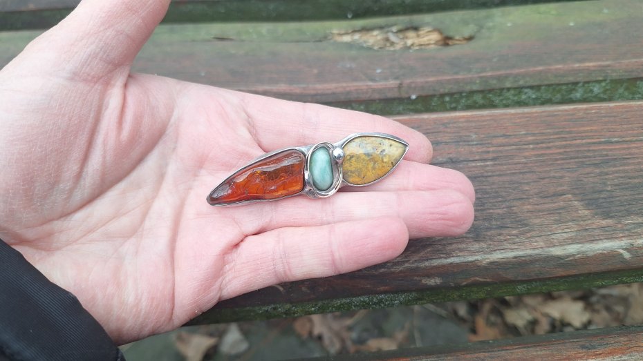 Broszka wykonana z miedzi, cyny, chryzoprazu, bursztynu i jaspisu. Wymiary ok. 6.5 na 1.5 cm. Zapięcie metalowe.