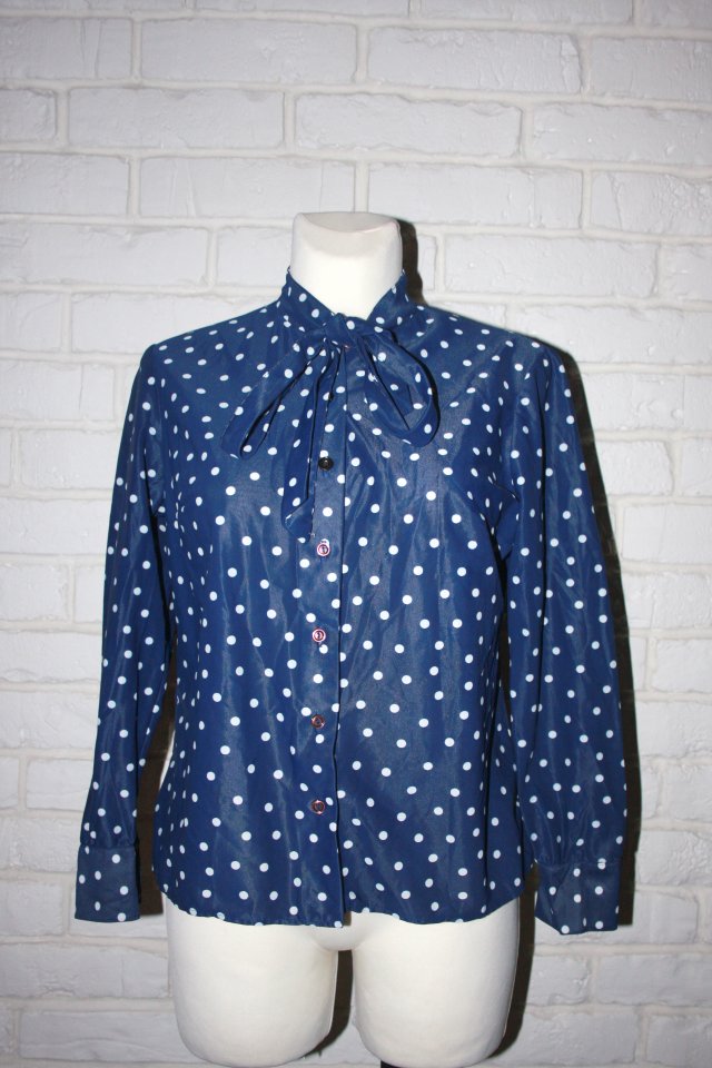 krótka bluzka vintage w białe groszki, zapinana na guziki, pod szyją wiązana, rękaw zapinany na guzik
