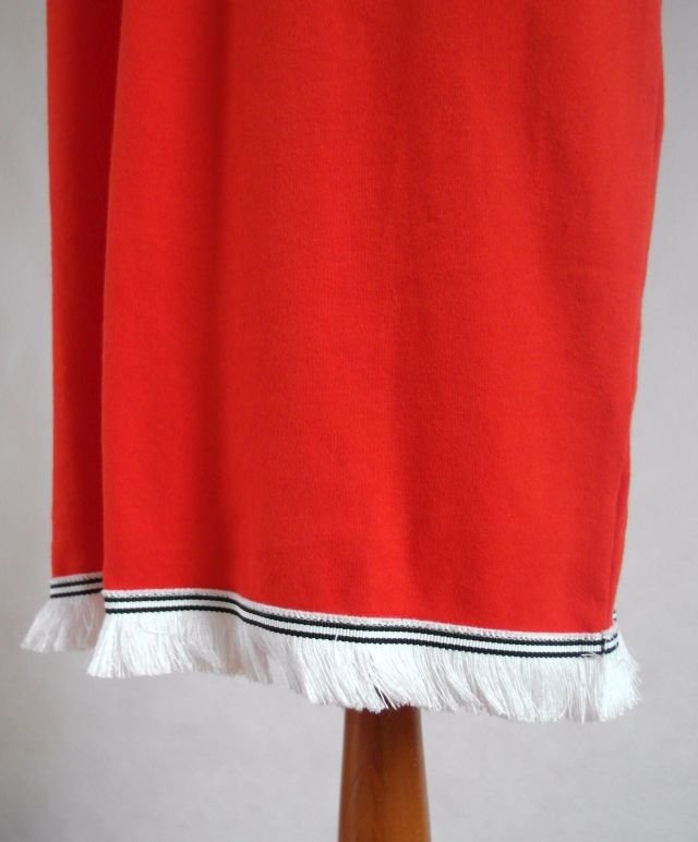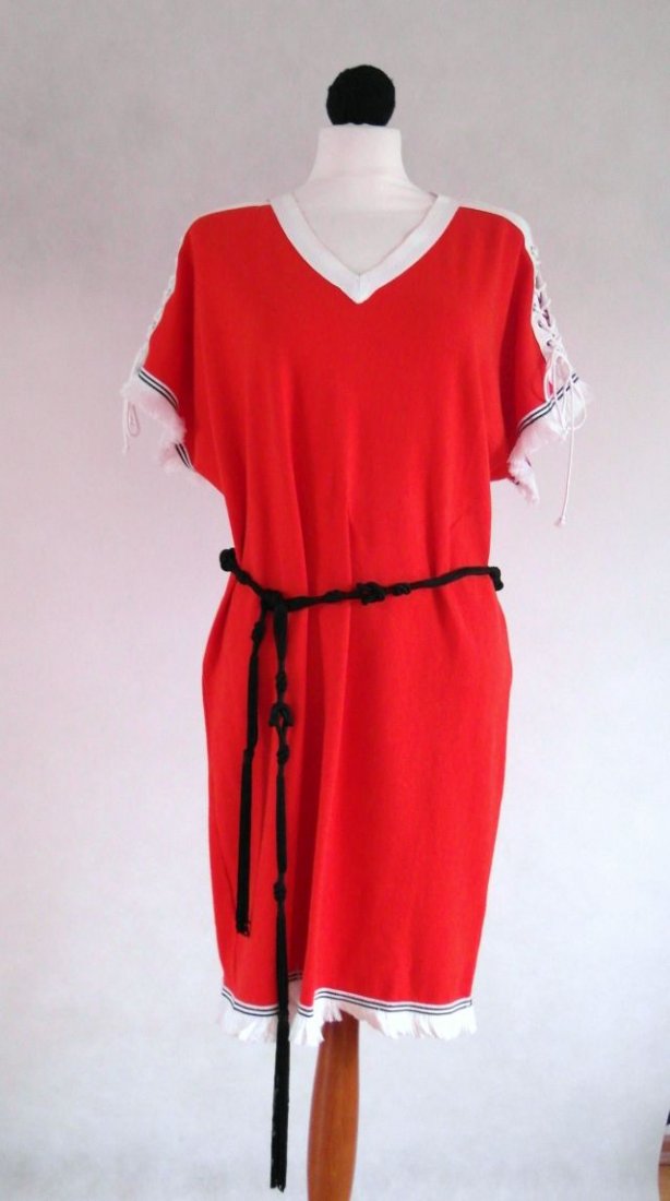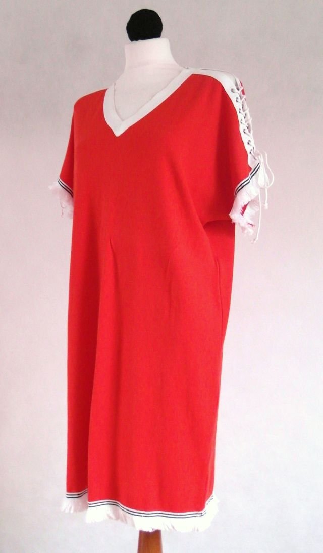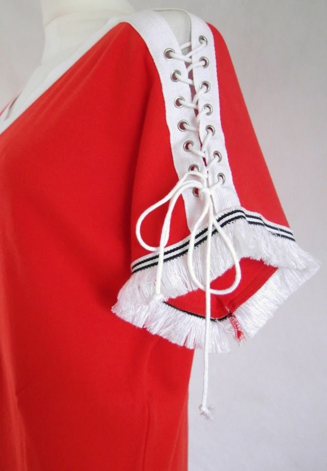 Energetyczna, koralowa czerwień ozdobiona frędzelkami u dołu i przy rękawach.Ramiona sznurowane z troczkiem,kolor ecru.