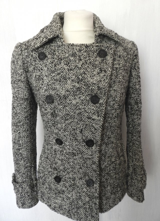 Klasyczny zapinany dwurzędowo płaszczyk w jodełkę czarno - biały