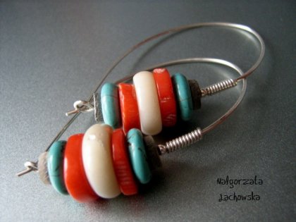 Efektowne, modne kolczyki wykonane z krążków korala beżowego i pomarańczowego, howlitu i muszli teczowej. Całość w srebrze próby 925. Długość kolczyków wynosi 5 cm.