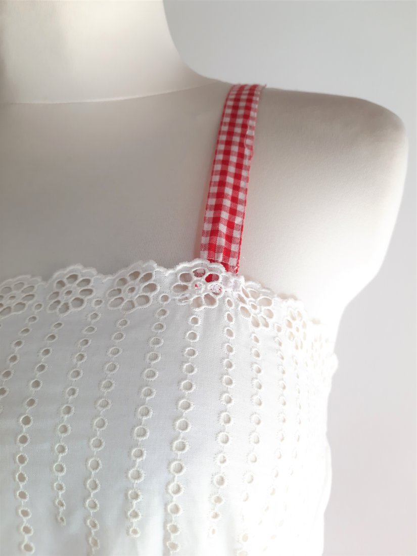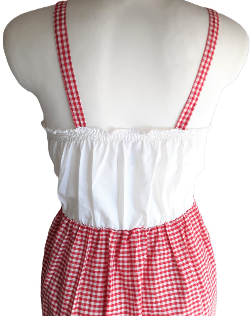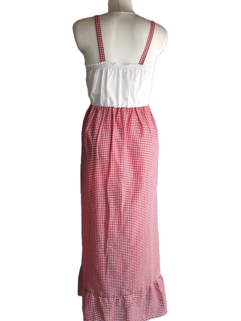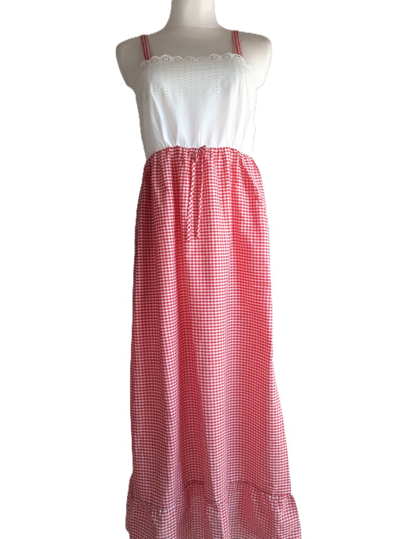 piękna letnia długa sukienka vintage według mnie z lat 80-tych, dół w drobną biało-czerwoną kratę, góra sukienki w kolorze białym z przepięknym haftem angielskim, kontrastowe kraciaste cienkie ramiączka, ozdobna kokardka w okolicy pasa, sukienka w pasie odcinana, dół zakończony falbaną, na plecach i z tyłu w pasie wszyta gumka, bez podszewki, cienki, lekki materiał