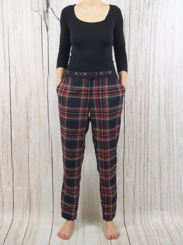 Świetne portki w kratę z 1) poliestru 65%, wiskozy 32%, elastyny 3%, 2) poliestru 74%, wiskozy 20%, elastyny 6%, 3) bawełny 97%, elastyny 3%.