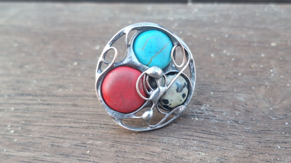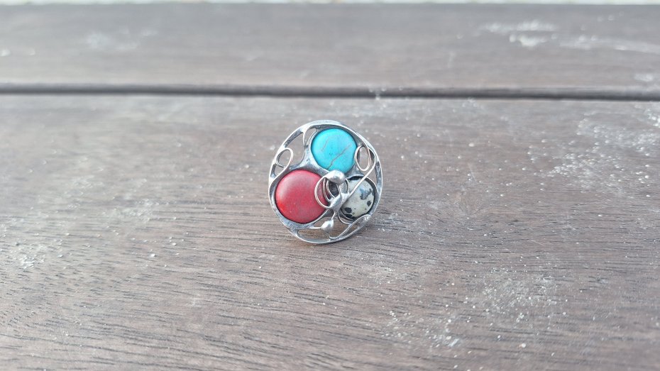 Pierścionek wykonany z miedzi, cyny, jaspisu i howlitów. Wymiary ok. 2.5 na 2.5 cm. Regulowany. Nie jest ciężki.