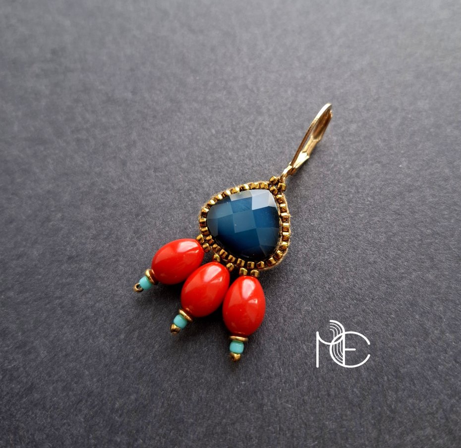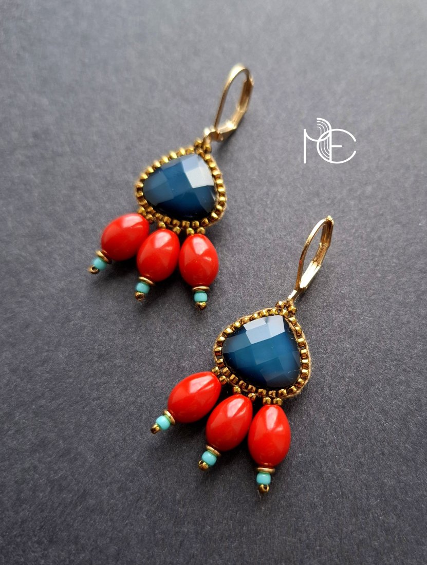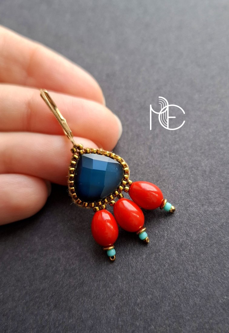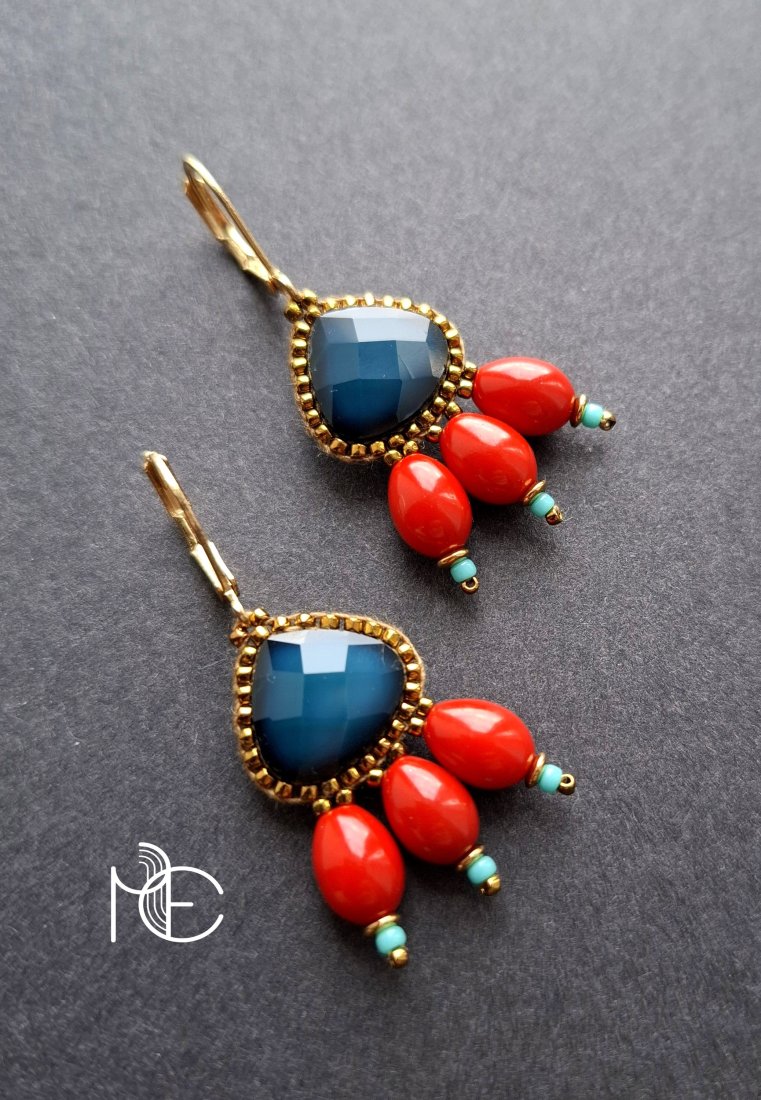 Kolczyki wiszące wykonane techniką swoistego haftu drobnymi, szklanymi koralikami w połączeniu z hematytami platerowanymi. Dwustronne, podwieszone na pozłacanych, nieuczulających biglach typu angielskiego. Wymiary: długość wraz z zapięciem - 4,5 cm, szerokość max. 2 cm.