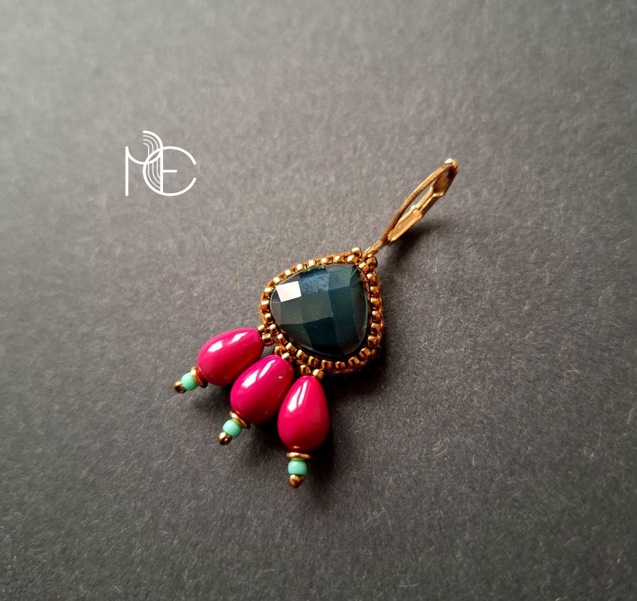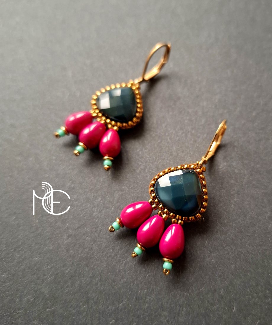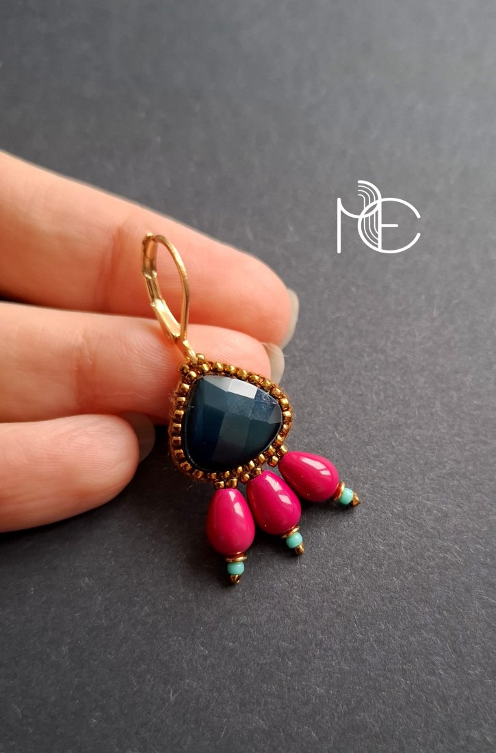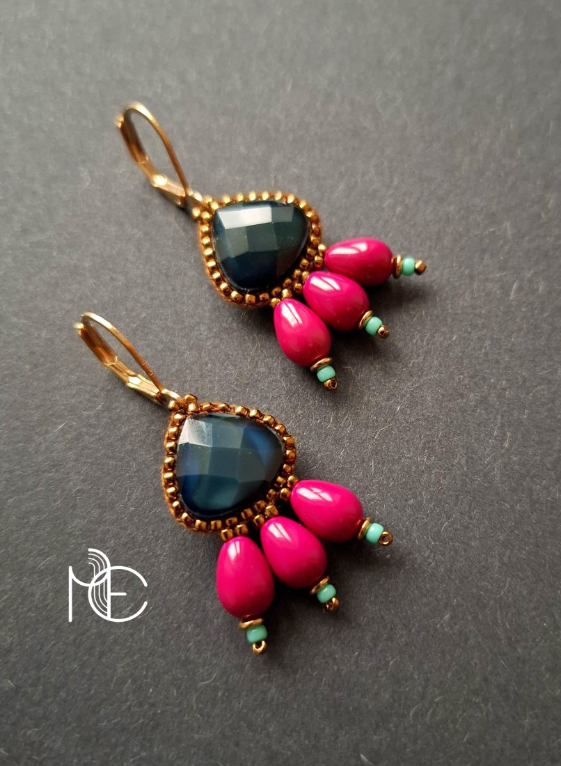 Kolczyki wiszące wykonane techniką swoistego haftu drobnymi, szklanymi koralikami w połączeniu z hematytami platerowanymi. Dwustronne, podwieszone na pozłacanych, nieuczulających biglach typu angielskiego. Wymiary: długość wraz z zapięciem - 4,3 cm, szerokość max. 2 cm.