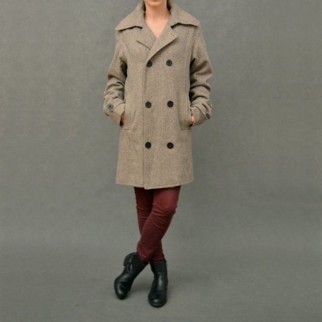 Prosty płaszcz w jodełkę w męskim stylu. Zapinany na dwurzędowe guziki, po bokach kieszonki. Na lekko ocieplanej podszewce. Ciepły, w 60% z wełny.