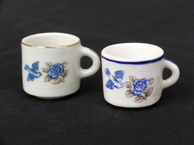 Duet jednakowym wzorem zdobionych ale nieco różnych kubeczków ceramicznych :) 3 x 4 x 3 cm. Stan zachowania dobry.