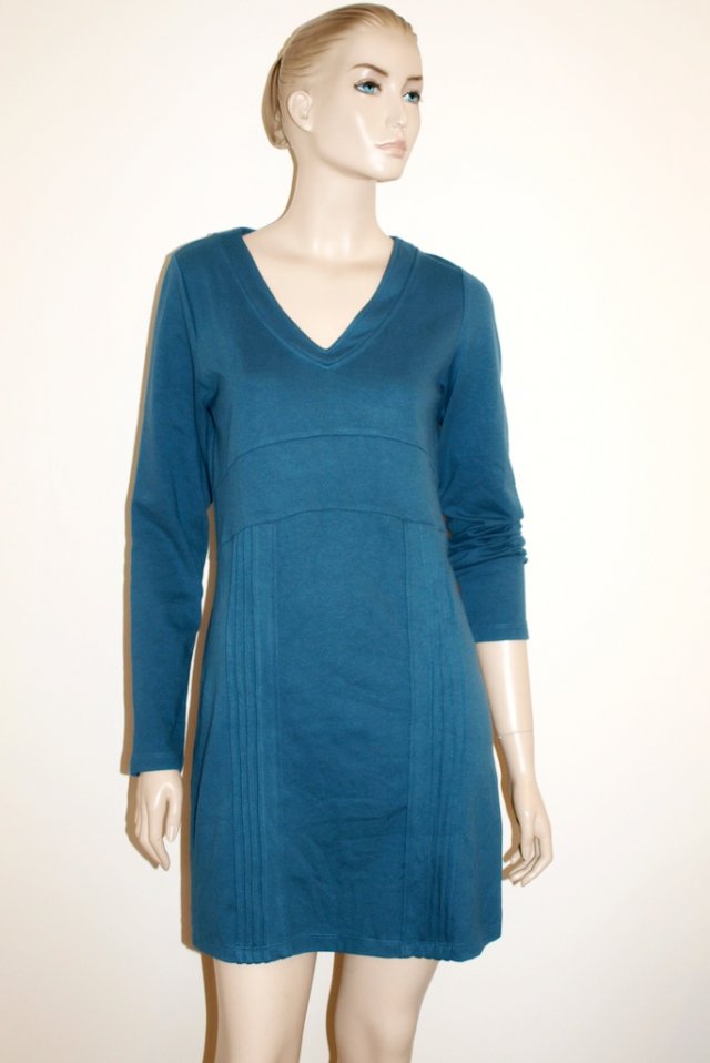 Sukienka marki yest w moim zdaniem morskim kolorze. Materiał mięsista dzianina 70% wiskoza 25% nylon 5% elastan. stan bardzo dobry. Rozmiar z metki S, ale chyba wieksza, na manekinie o rozmiarze 38. Podaję wymiary mierzone na płasko;