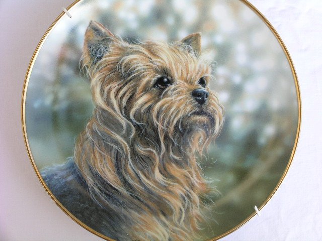 Wysokiej jakości porcelanowy talerz dekoracyjny z serii z uroczymi wizerunkami Yorków. Sygnowany, ekskluzywny. Rant bogato złocony; malatura niezwykłej, fakturowej jakości. 21 x 2,5 cm. Stan zachowania idealny. Z tyłu profesjonalny uchwyt do powieszenia.