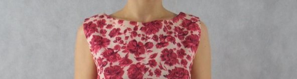 Przecudna sukienka w róże z dekoltem w kształcie łódki.