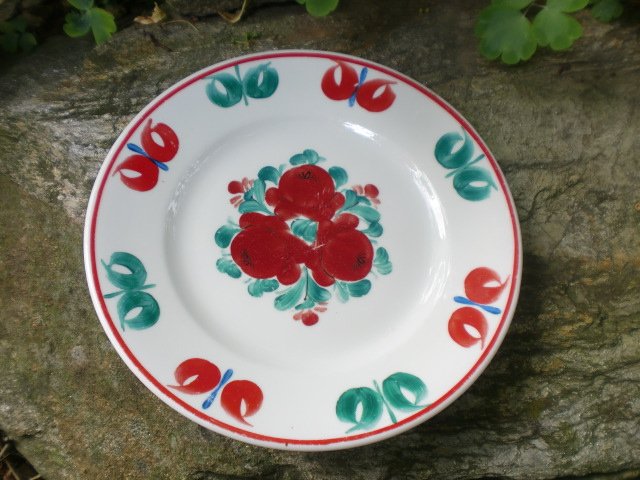 Porcelanowy talerzyk malowany w róże czerwone z zielonymi i czerwonymi zawijaskami na brzegu. Kolorystyka żywa, nasycona - fajny talerzyk do sezonowych owoców np. truskawek czy czereśni...choć nie tylko. Ma dziurkę z tyłu więc można go powiesić.