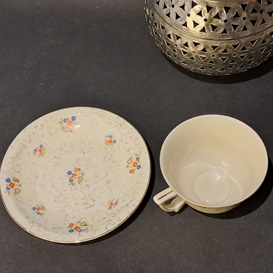 Porcelana ozdobiona jest drobnymi, stylizowanymi motywami kwiatowymi w kolorach niebieskim, pomarańczowym i zielonym oraz marmurkowym chintzem. Brzegi filiżanki i spodka są wykończone cienką, złotą obwódką.
