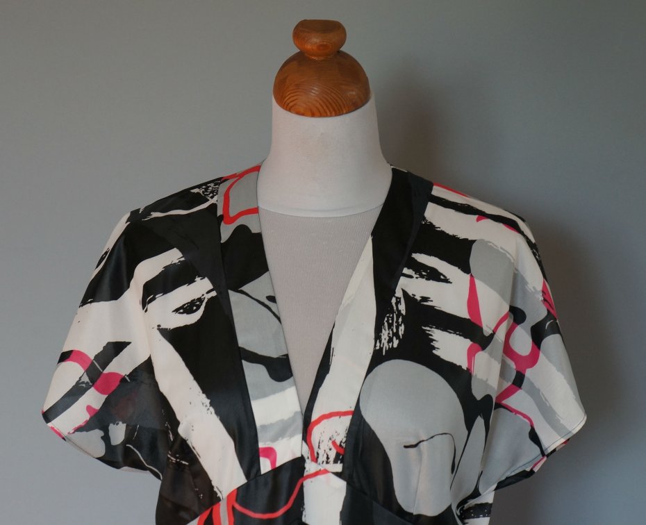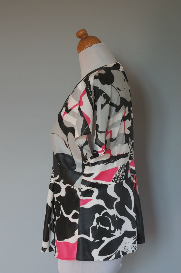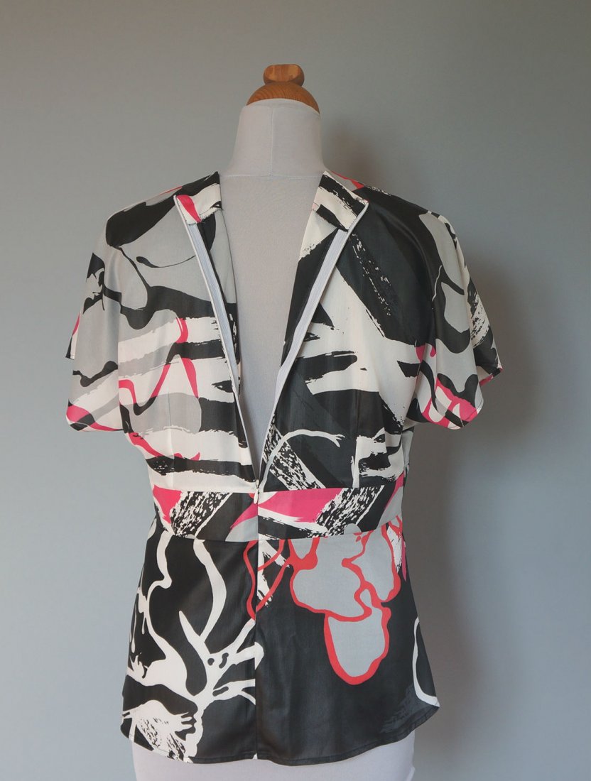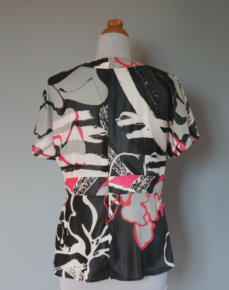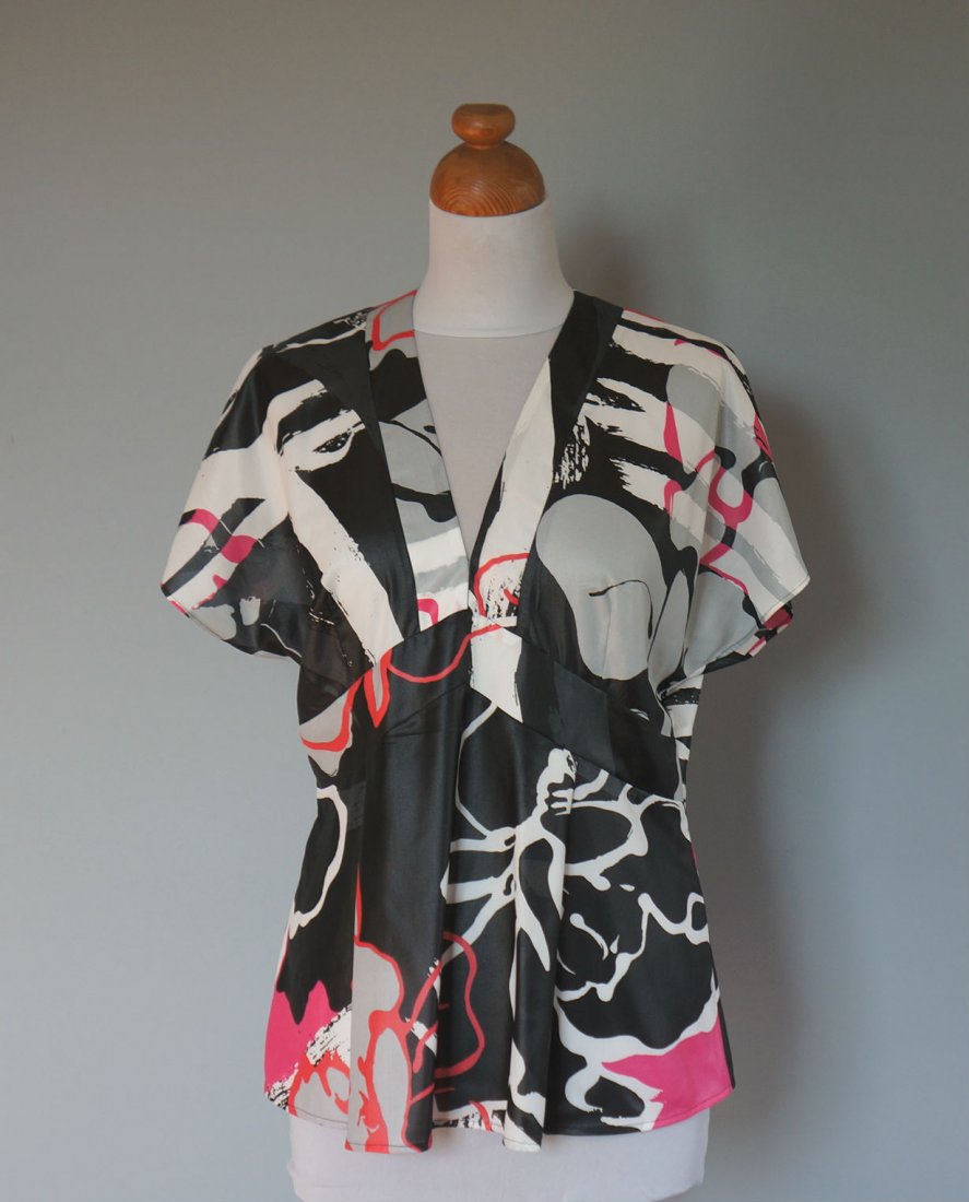 Bluzka/tunik z dekoltem w serek. Opadające ramiona tworzą krótki rękaw. Z tyłu długi zamek - 47 cm. Materiał lejący, nie gniecie się.