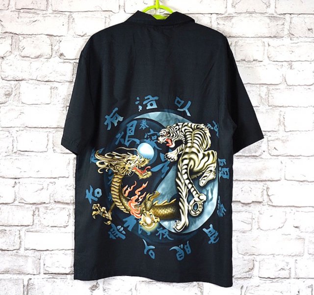 Czarna bluzka koszulowa, / koszula w japońskim stylu z motywem smoka / tygrysa , zapinana na guziczki, pod szyją kołnierzyk.